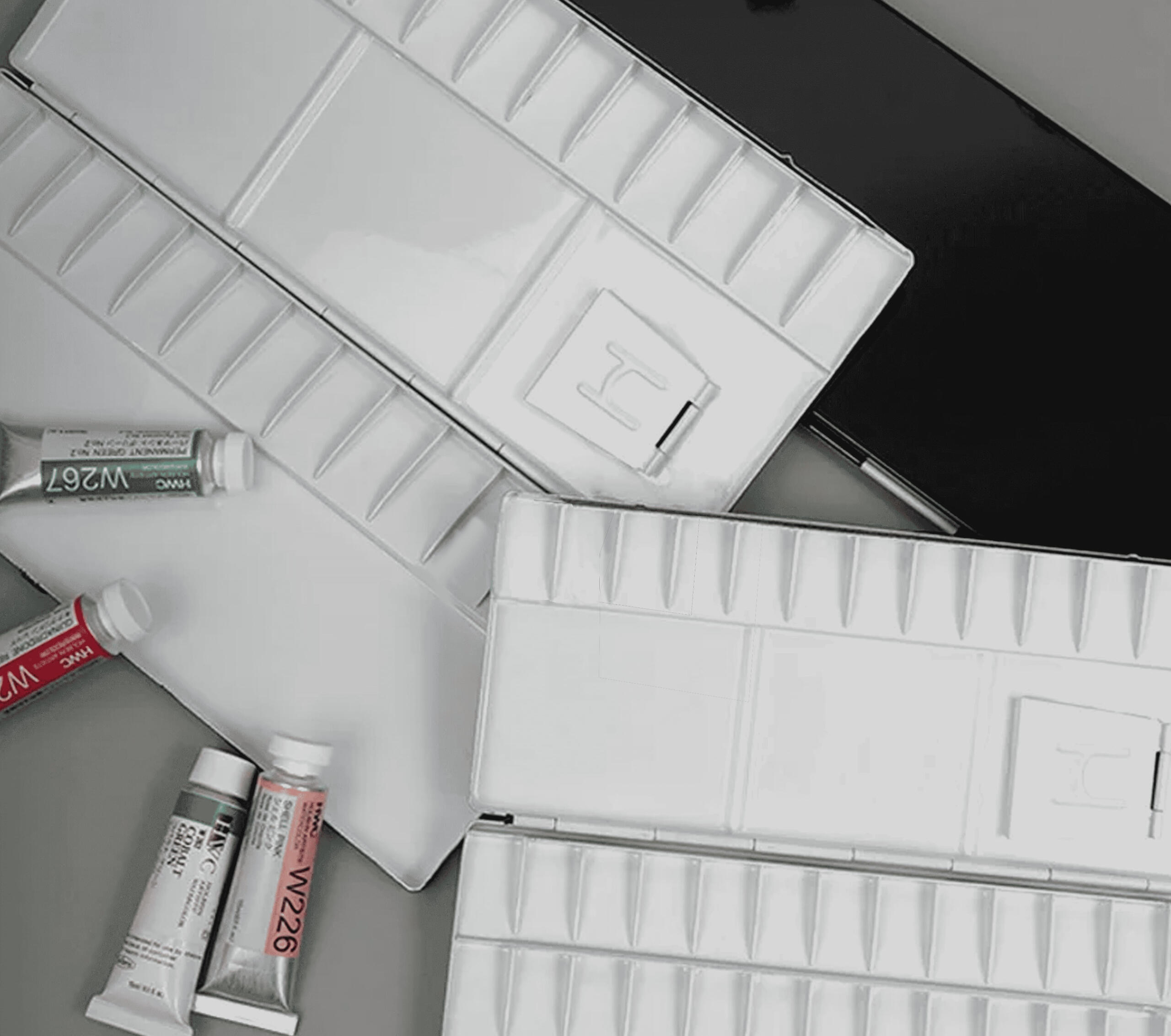 Holbein Alüminyum Katlanır Suluboya Paletleri, iç kısmı beyaz emaye kaplı ve başparmak deliği bulunan siyah Japon kaplamaya sahiptir.1130-45 (kapalı 4-1/4″ x 9-7/8″, 13 kuyu)